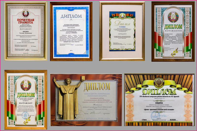 Государственное учреждение культуры «Жлобинская центральная районная библиотека имени Н.К. Крупской» награждена Дипломом Жлобинского районного исполнительного комитета.