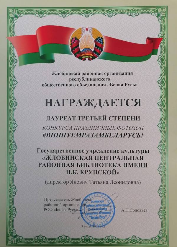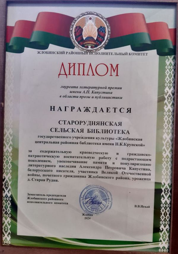 Жлобинская центральная районная библиотека имени Н.К.Крупской награждена дипломом 1 степени за работу по литературному краеведению.