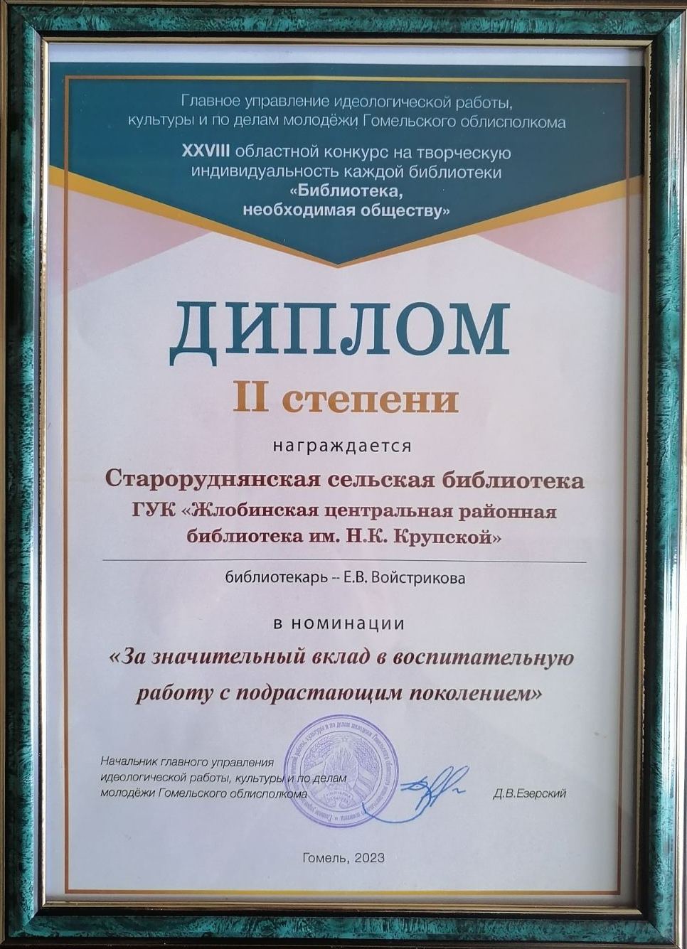 Государственное учреждение культуры «Жлобинская центральная районная библиотека имени Н.К. Крупской» награждена Гомельской Епархией Дипломом победителя областного тура республиканского конкурса "Библиотека - центр духовного просвещения и воспитания" в номинации "Духовно-нравственное воспитание детей и подростков".